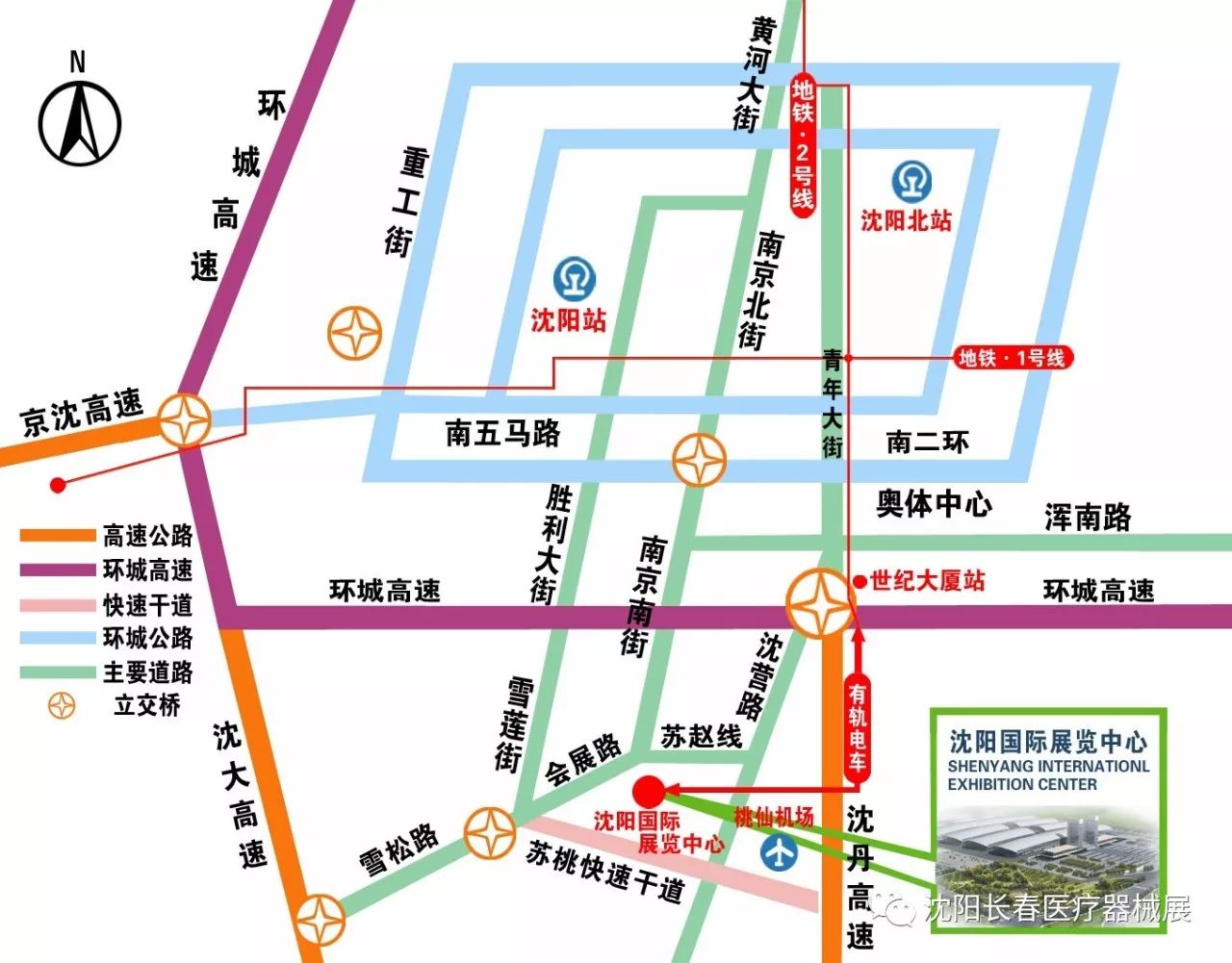 333路:沈陽北站→彩電中心→交通駕??荚噲觯ㄉ蜿枃H展覽中心) 327路:沈陽站→十里錦城站下車,沿會展路向東步行300米可以到達沈陽國際展覽中心 335路:21世紀廣場→雪松路口下車,沿會展路向東步行300米可以到達沈陽國際展覽中心 165路:鐵西家樂?!镥\城站下車,沿會展路向東步行300米可以到達沈陽國際展覽中心 165路:鐵西家樂?!镥\城站下車,沿會展路向東步行300米可以到達沈陽國際展覽有軌電車:有軌電車2號線--有軌電車1號線(有軌電車2號線,桃仙機場站上車,新松智慧園站下車,步行200米,轉乘有軌電車1號線,新松智慧園站上車,會展中心站下車,步行410米至沈陽國際展覽中心)